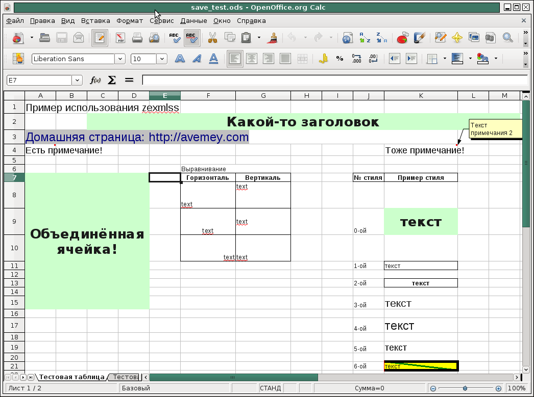Документ, созданный с помощью zexmlss открытый в OpenOffice Calc